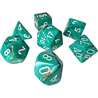 A set of 7 Marble, Polyhedral dice in Oxi-Copper and White.